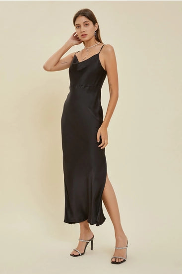 Enhance your wardrobe with this elegant Black Cowl Neck Slip Dress. The sleek design and comfortable material will make you feel confident and stylish. The versatile cowl neck can be dressed up or down for any occasion. Made with high-quality fabric for a luxurious look and feel.