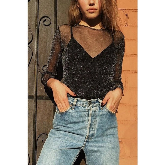 Introducing our Black Mesh Shiny Long Sleeve Top, expertly crafted from premium materials. With its mesh fabric and shiny finish, this top provides both comfort and style. Perfect for any occasion, it's a must-have addition to your wardrobe.